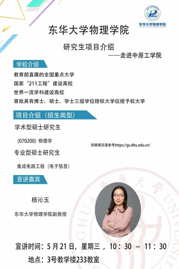 为搭建校际学术交流桥梁,精准助力学子明晰考研方向、深入了解优质院校研究生招生政策,5月21日上午,东华大学物理公司杨沁玉副教授应邀做客BSports,带来一场“干货满满”的研究生招生专场宣讲。BSports师生代表悉数到场。